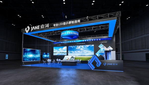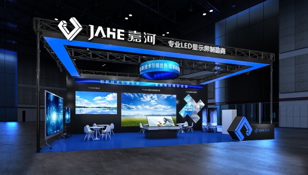 展臺頂部有醒目的 “JAHE 嘉河 專業(yè) LED 顯示屏制造商” 的標識,明確傳達了展臺的品牌和業(yè)務(wù)范圍。展臺內(nèi)部分為多個展示區(qū)域,每個區(qū)域都有不同的 LED 顯示屏展示。