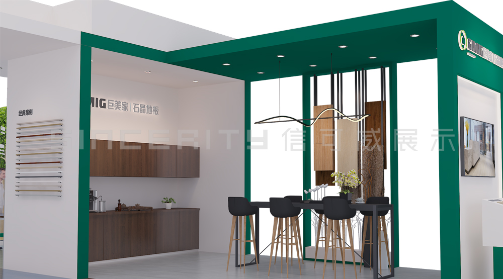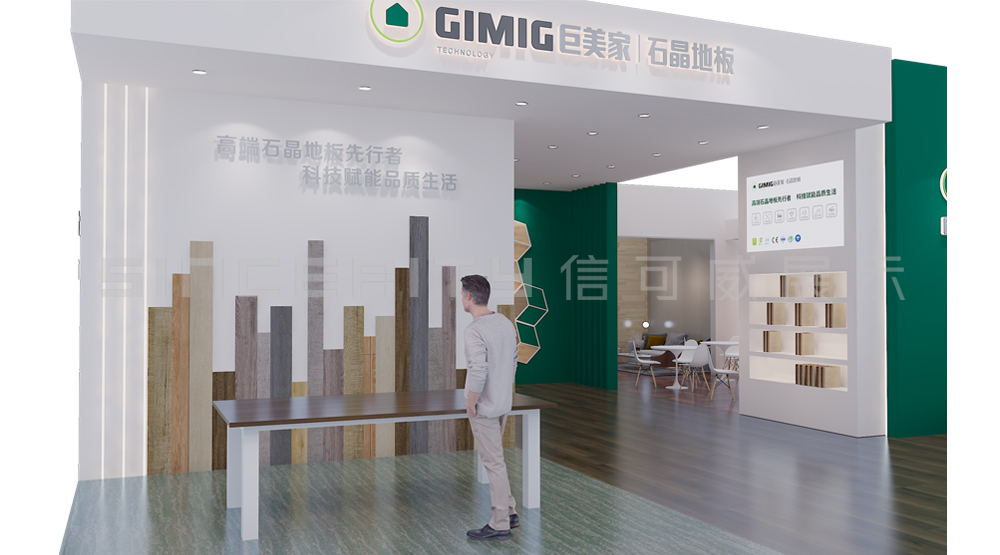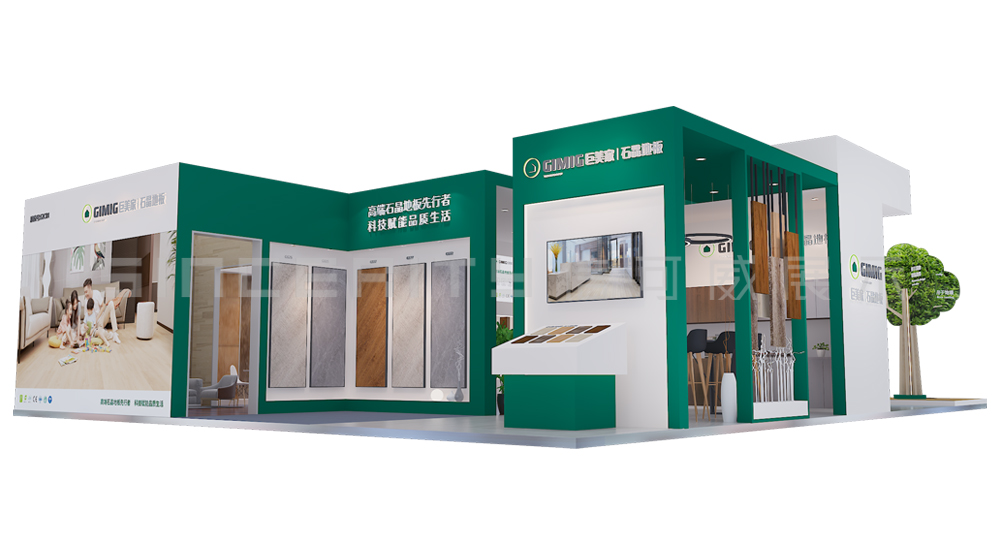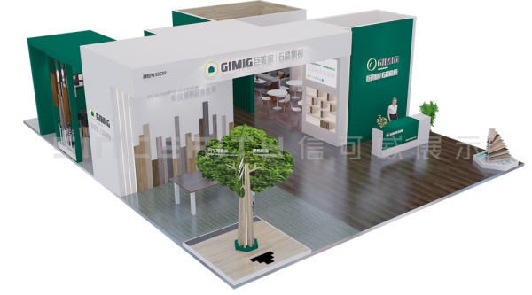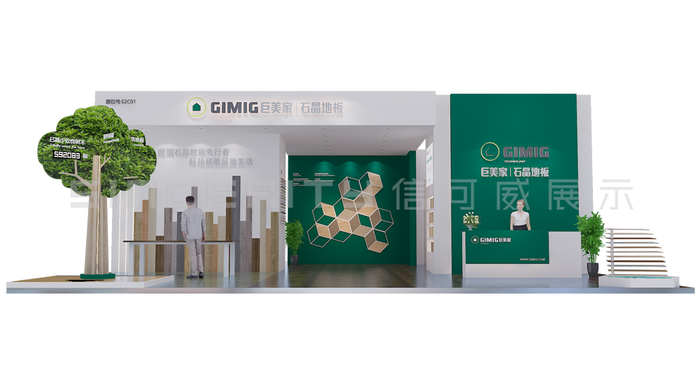 上海酒店用品展臺設(shè)計以白色和綠色為主色調(diào),營造出清新、環(huán)保的氛圍。展臺的正中央有一棵栩栩如生的綠樹,象征著自然與環(huán)保。攤位的正面和側(cè)面都有顯眼的品牌標(biāo)識 “GIMIG 巨美家 | 石英地板”,并配有標(biāo)語 “高端石英地板先行者 科技賦能品質(zhì)生活”,突出了品牌的定位和理念。