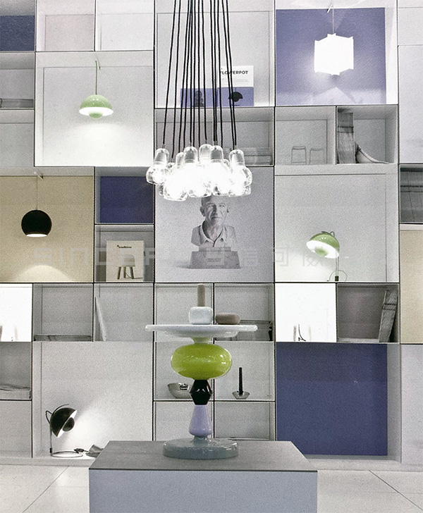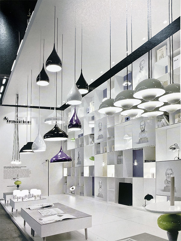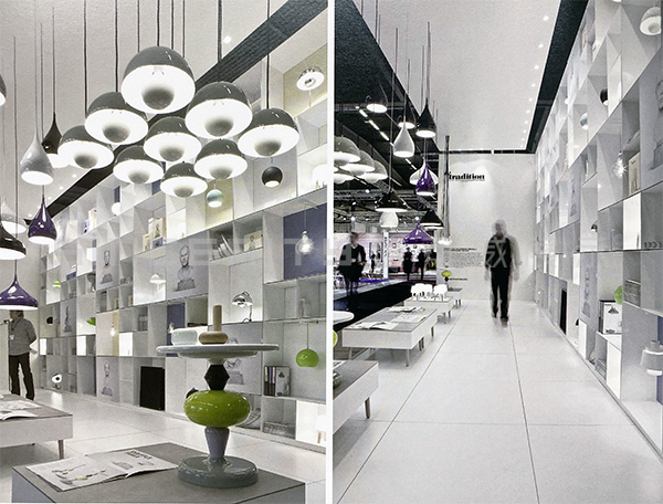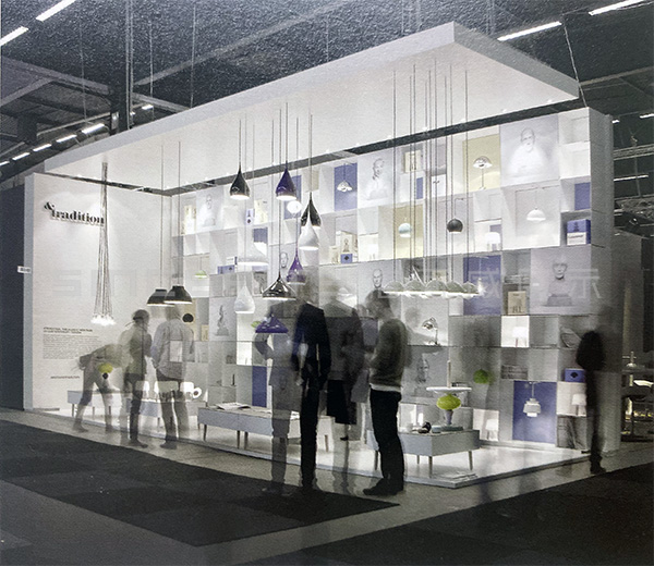 本項(xiàng)目是傳統(tǒng)公司在斯德哥爾摩家具展上的丹麥&tradition的燈具展臺(tái)設(shè)計(jì)。相比較而言,此展廳長(zhǎng)而窄,很明顯只能在垂直方向上做文章。眾多格子頗有韻律地堆砌在一起,顯得俏皮而嚴(yán)肅,這正符合品牌的定位。展廳前后的顏色與&傳統(tǒng)的商標(biāo)一致,公司設(shè)計(jì)師的大理石半身像被印成圖片掛在前面。展品與多維度的貨架完美地結(jié)合在一起,給人一種比例扭曲的感覺(jué)。形態(tài)各異的吊燈自天花板垂下,一起構(gòu)成一襲透明的窗簾。