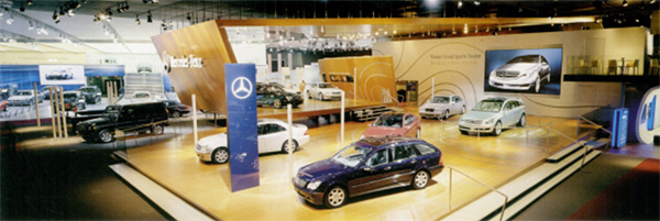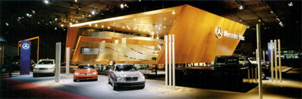 梅賽德斯-奔馳公司展示空間設(shè)計(jì)由辛德勒建筑師事務(wù)所設(shè)計(jì),該展場的設(shè)計(jì)是三面敞開的空間,剩下一面則由另一個(gè)參展商的展場界定。梅賽德斯一奔馳公司的展場由一個(gè)可供穿行的雕望體和各式各樣的展示地板所組成,從展場中心能很容易地到達(dá)任何一處。