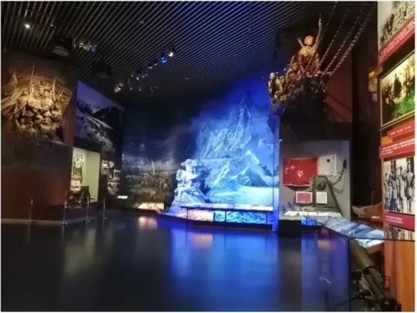 以上圖所展示的渡江戰(zhàn)役”場景為例,謳歌了中國人民解放軍以木帆船為主要航渡工具,一舉突破國民黨軍的長江防線,并以運(yùn)動戰(zhàn)和城市攻堅(jiān)戰(zhàn)相結(jié)合,合圍并殲滅其重兵集團(tuán)。場景的展品內(nèi)容非常豐富,其中包含一級標(biāo)題版、圖文展板、人物雕塑、浮雕造型墻、金屬立體字、展柜、燈箱、多媒體等重要文物展品,光影的過渡變化也很自然,既有突出翻越大雪山時艱苦環(huán)境的冷色調(diào),也有勝利跨江會師后讓人喜悅的暖色調(diào)。