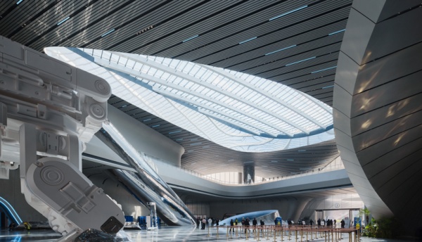 成都科學(xué)館以“星云狀”建筑外觀為核心意象,占地面積約9.2萬(wàn)平方米,總建筑面積5.96萬(wàn)平方米,其造型如振翅欲飛的星際巨艦,銀色金屬屋面在日光下折射出流動(dòng)的光澤,宛如宇宙塵埃凝聚而成的動(dòng)態(tài)星云。