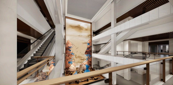 進(jìn)入展館,觀眾首先進(jìn)入前廳部分。前廳是功能區(qū)的一部分和參觀的準(zhǔn)備區(qū)。前廳兩側(cè)均勻分布山川水墨畫,與古井貢酒產(chǎn)品蘊(yùn)含的清新淡雅之風(fēng)相得益彰,使觀眾對(duì)古井貢酒的產(chǎn)品有一個(gè)初步的認(rèn)識(shí)。參觀觀眾向右進(jìn)入展館進(jìn)行參觀。