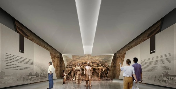 原建筑序廳空間為6900mm寬、10000mm進深, 擁有良好的縱深感,為此,我們設計孫中山鄧世昌、張弼士以圓雕的形象迎面走來,背后跟隨諸位膠東革命志士、政軍人物、文藝名人、實業(yè)楷模奮勇向前,追求民族的獨立和解放。觀眾可穿行其中,感受與這些名人同行的信念,兩側藝術肌理墻以開放的形態(tài)寓意開拓、拼搏精神的延續(xù)與傳播。