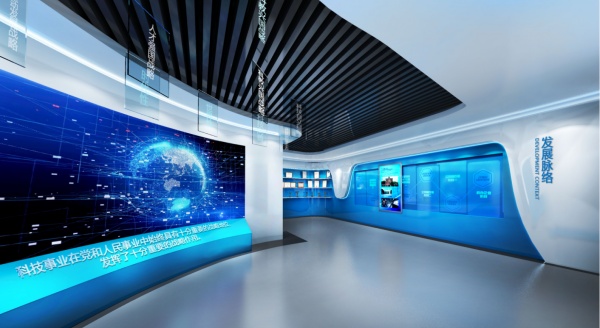 每個空間的輻射半徑是有限的,那如何在有限的空間中展現(xiàn)出主題的內(nèi)容,我們需要找尋在空間的視覺中心,并且在視覺中心中衍生交互展示的概念拓展。這次我們收到的委托命題,基于企業(yè)需求,我們決定用藍色來闡述這個空間。用顏色來闡述企業(yè)的辨識度,以簡約的設計體塊去表達空間為企業(yè)展廳賦予全新的生命力。