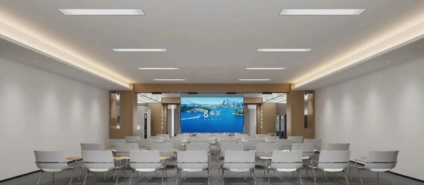 走進(jìn)這里,首先被簡約大氣的空間質(zhì)感所吸引。淺木色飾面包裹的區(qū)域與純白墻面形成柔和對比,線性燈光均勻鋪陳,讓空間明亮又通透。整齊排列的白色座椅搭配簡約桌臺,滿足多人研討、培訓(xùn)的需求;盡頭的高清大屏則為環(huán)保知識講解、案例分享提供了清晰的視覺載體。